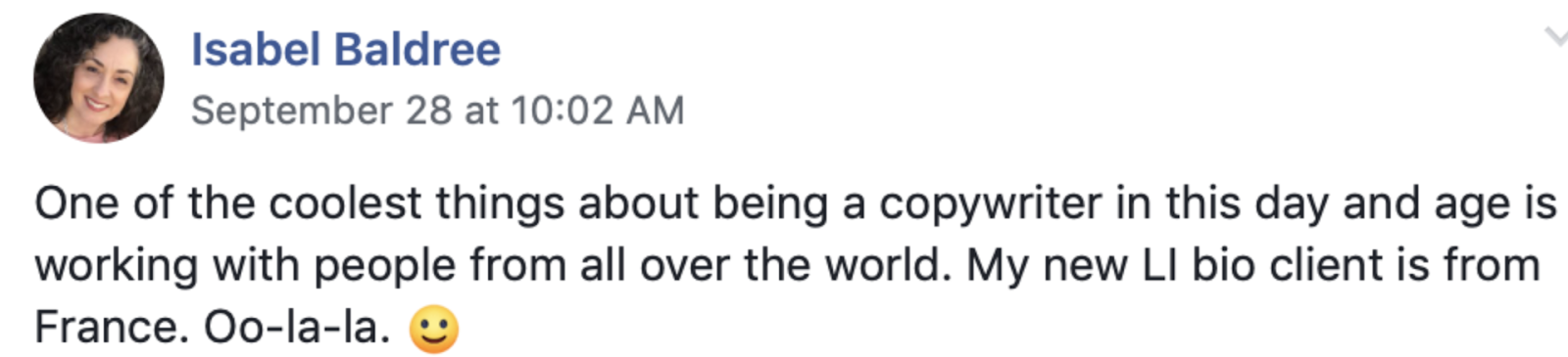 When you do that, and as you gain skill specializing in LinkedIn bios, you can add on extra services, or even start writing About Me pages for client websites and blogs, by maximizing these same basic strategies.