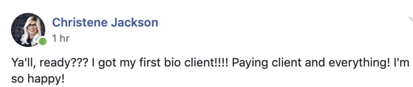 You see, entrepreneurs often need a Bio…for sharing with a podcast host, on their websites, for speaking engagements…so once you learn the skill you can branch out in many directions with the SAME skills.